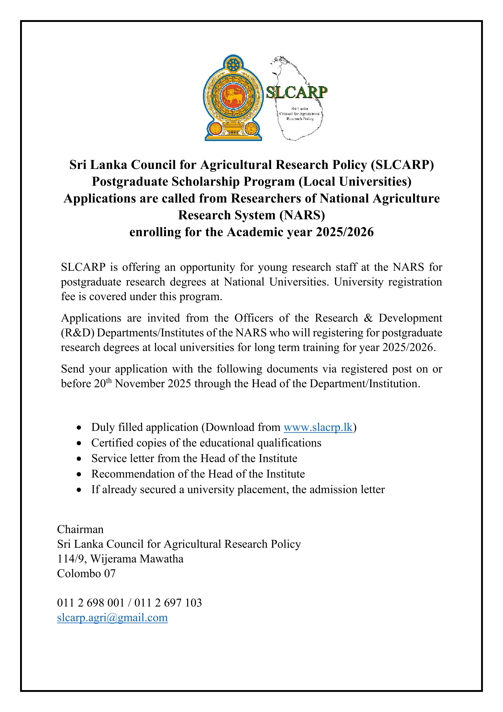 Sri Lanka Council for Agricultural Research Policy (SLCARP) Postgraduate Scholarship Program (Local Universities) Applications are called from Researchers of National Agriculture Research System (NARS)