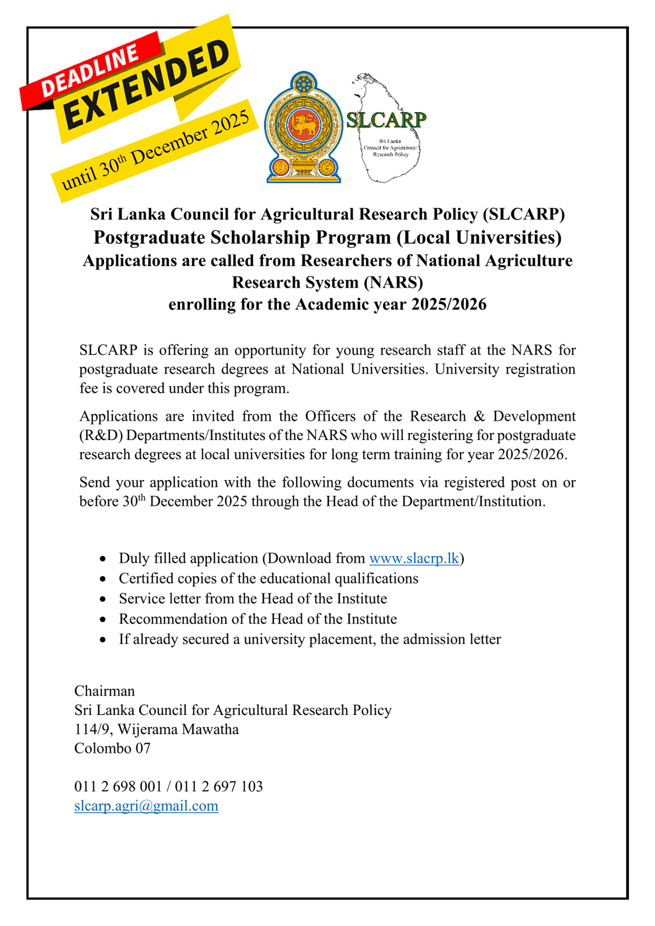 Sri Lanka Council for Agricultural Research Policy (SLCARP) Postgraduate Scholarship Program (Local Universities) Applications are called from Researchers of National Agriculture Research System (NARS)